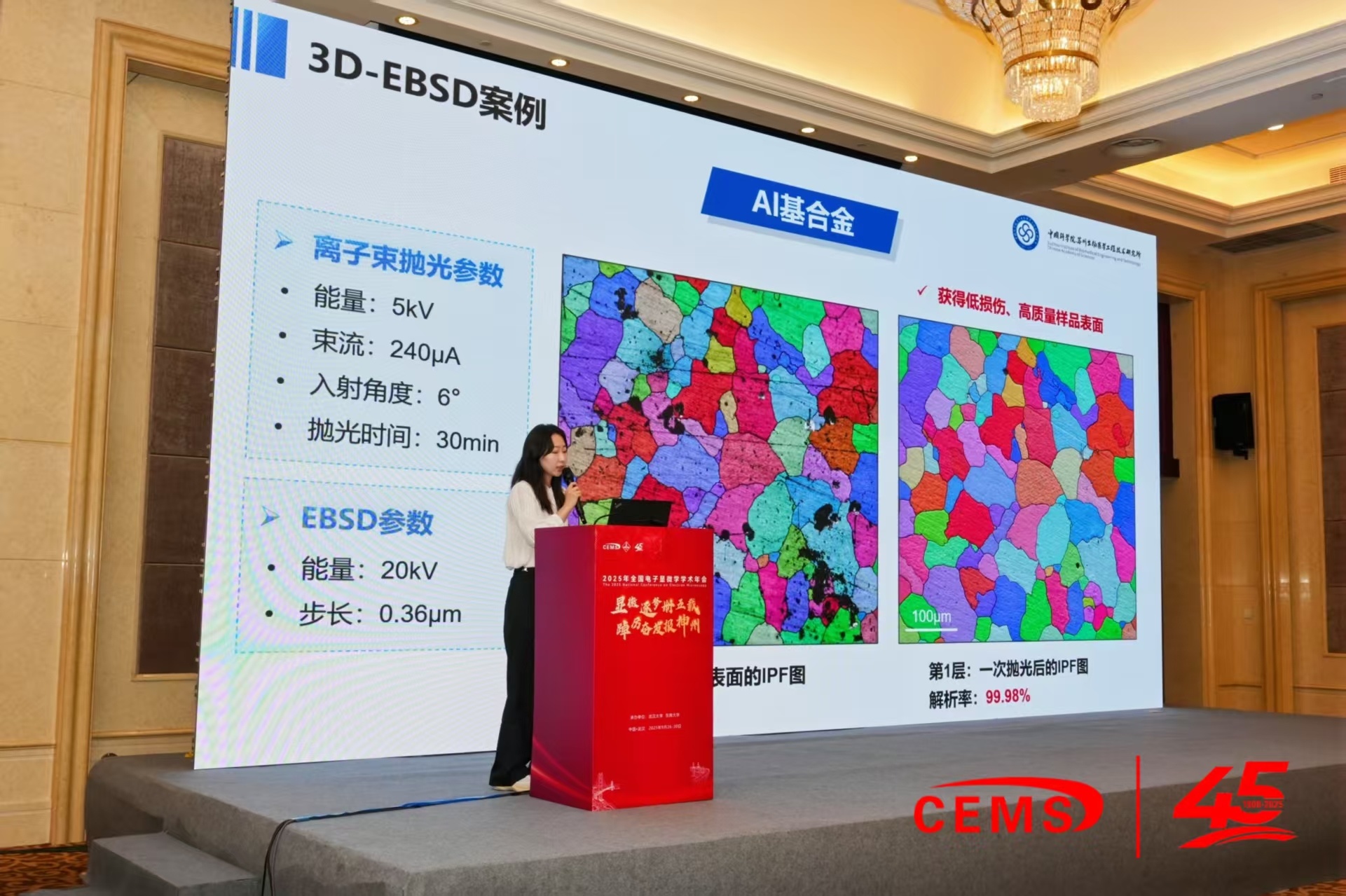 27日下午,中国科学院苏州生物医学工程技术研究所助理研究员、屹东光学项目经理贾晨,于第七分会场为大家带来了题为《氩离子束扫描电镜在3D-EBSD中的应用》的精彩报告,聚焦屹东光学行业首创产品——氩离子束场发射扫描电子显微镜ABSEM 200,重点介绍了ABSEM 200在3D-EBSD应用中“大尺寸”、“原位切削”、“零损伤”等的优势,内容紧密结合行业需求,凭借专业视角与务实分享,迅速吸引了现场参会者的关注。